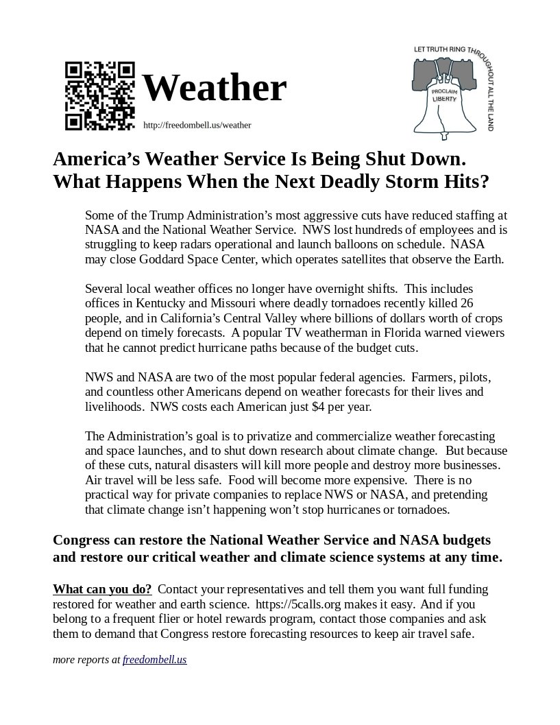 The Administration's goal is to privatize and commercialize weather forecasting and space launches, and to shut down research about climate change. But because of these cuts, natural disasters will kill more people and destroy more businesses. Air travel will be less safe. Food will become more expensive. There is no practical way for private companies to replace NWS or NASA, and pretending that climate change isn't happening won't stop hurricanes or tornadoes.